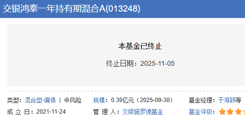 中国经济网北京12月16日电 今日,交银施罗德基金发布交银施罗德宏泰一年持有期混合型证券投资基金清算报告。报道称,交银施罗德宏泰一年期控股混合型证券投资基金已获得中国证监会(以下简称“证监会”)证监发〔2021〕号《基金合同》“第五部分基金备案”中规定的募集登记“三、基金存续期间基金份额持有人数量及资产规模”:“《基金合同》生效后,如果基金份额数量持有人数量不足200人或连续20个工作日基金资产净值低于5000万元的,基金管理人必须在连续5个工作日以上报告,必须召开基金h会议终止iffund条约。长辈。 “截至2025年11月4日,基金资产净值连续50个工作日低于5000万元,触发《基金合同》约定的基金合同终止。《基金合同》自动终止,基金管理人按照法律法规的规定和《基金合同基金》的规定,清算基金财产,无需召开基金持有人会议。”交通施罗德基金管理有限公司关于《交通银行施罗德宏泰一年持有期混合型证券投资基金基金合同终止及基金财产清算的函》,该基金自2025年11月5日起进入清算程序。截至2025年11月2日净值2日,交行价值宏泰一年持有期混合型账户余额为1.0619元1.0451元,复合收益率6.19%和 4.51%。交银宏泰一年持有期混合A累计回报 交银宏泰一年持有期混合C累计回报 资料来源:天天基金网络基金经理于海英于2004年至2006年担任北方国际信托投资有限公司固定收益研究员,2006年至2010年担任Pverb基金经理、Eright助理管理人、Pverb基金经理。 2010年至2014年任银华基金管理有限公司基金经理,2014年至2016年任五矿证券股份有限公司固定收益部投资管理部总经理。2016年加入交银施罗德基金管理有限公司固定收益投资有限公司董事。刘庆祥加入交银施罗德基金管理公司2016年加入股份有限公司,担任行业分析师、混合资产投资部助理基金经理。他将成为福自 2025 年 7 月 19 日起担任第二任经理。