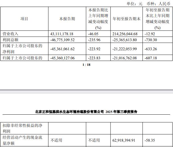 中国经济网北京11月11日电 正和生态(605069.SH)10月30日晚间披露2025年第三季度报告。报告期内,公司实现营业收入4311.12万元,同比下降46.05%;归属于上市公司股东的净利润-4536.11万元;归属于上市公司股东的扣除非经常性损益的净利润-4536.01万元。年初至报告期末,公司实现营业收入2.14亿元,同比下降12.92%;归属于上市公司股东的净利润-2122.21万元;归属于上市公司股东的扣除非经常性损益的净利润为-2101.68亿元;经营活动产生的现金流量净额6,291.84万元,同比下降58.35%。据公司2024年年报显示,报告期内,公司实现营业收入3.56亿元,同比增长118.00%;归属于上市公司股东的净利润为-1.68亿元,去年同期为-4.32亿元。元;归属于上市公司股东的扣除非经常性损益的净利润为-1.68亿元,去年同期为-4.32亿元;经营活动产生的现金流量净额1.54亿元,同比增长120.42%。正和生态连续三年亏损。 2022年,正和生态实现营业收入3.5亿元,归属于上市公司股东的净利润-3.39亿元,归属于上市公司股东的净利润扣除非经常性损益-3.43亿元。正和生态于2021年8月16日在上海证券交易所主板挂牌上市,社会公众股总数4071.11万股,发行价格15.13元/股。保荐机构为招商证券股份有限公司,保荐代表人为岳东、李寿春。该股目前正处于突破阶段。正和生态首次公开发行股票共募集资金6.16亿元,扣除发行费用后净募集资金5.29亿元。正和生态最终募集资金金额比原计划少9.24亿元。正和生态2021年8月4日发布的招股书显示,公司拟募集资金14.52亿元,将用于公司战略战略和管理提升、生态保护和环境研发能力提升资金、信息化建设项目、项目运营等。教育基金。正和生态首次公开发行股票发行费用总额为8714.61万元(不含税),其中保荐及承销费用5615万元。 2022年8月11日,公司每10股换3股,派发税前股息2元。除权及分红日为2022年8月17日,股权登记日为2022年8月16日。